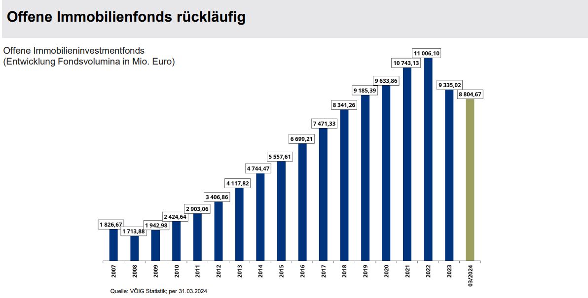 Das Fondsvolumen der offenen Immobilien-Investmentfonds verringerte sich seit Jahresende 2023 um 5,7 Prozent auf rund 8,8 Mrd. Euro, wobei sich die Nettomittelabflüsse auf 547,8 Mio. Euro und die Kursgewinne auf rund 17,4 Mio. Euro beliefen. Die 5 Immobilien-Investmentfondsgesellschaften verwalteten 13 Fonds (8 Publikumsfonds und 5 Spezialfonds). Die durchschnittliche 1-Jahres-Performance betrug 1,2 Prozent. Die 10-Jahres Performance betrug 2,1 Prozent.
