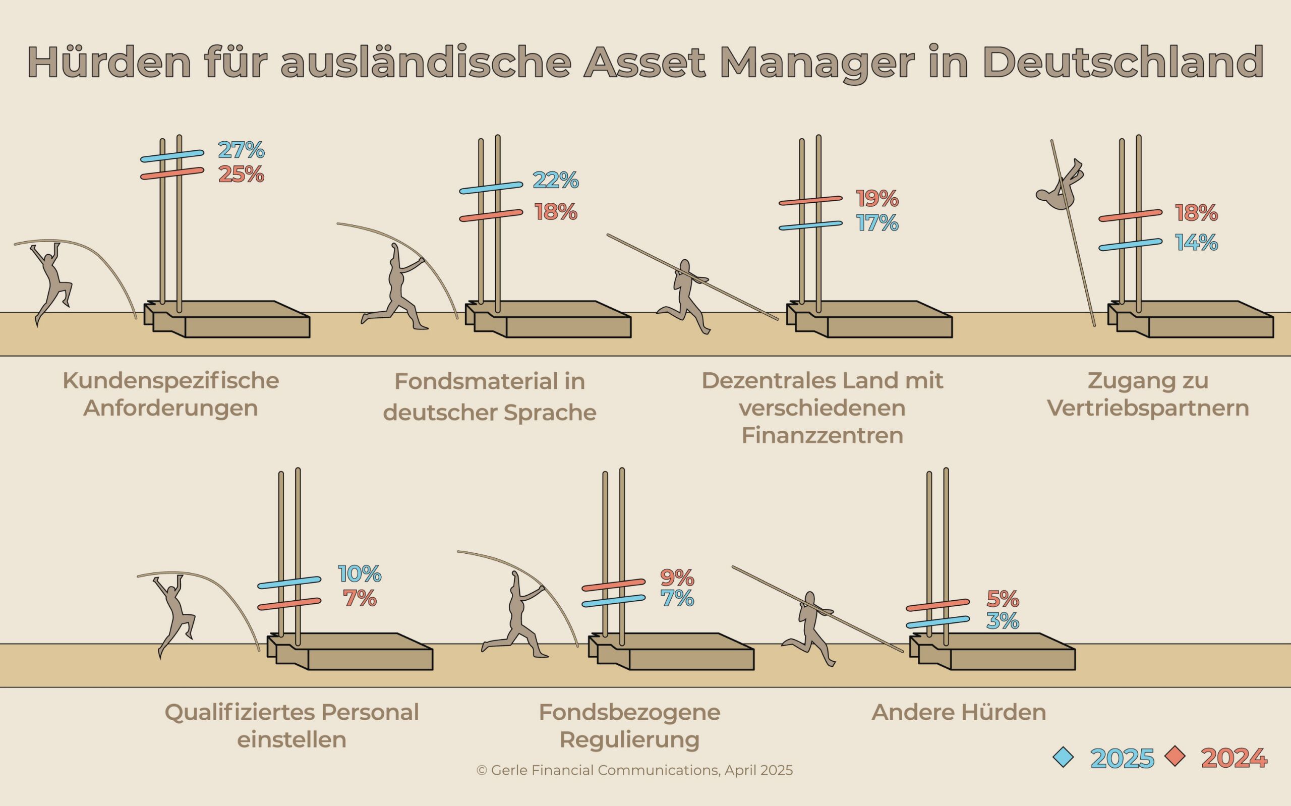 Ausländische Asset Manager sehen vor allem individuelle Anforderungen deutscher Investoren, etwa beim Reporting oder steuerlichen Vorgaben (27%), sowie Sprachbarrieren (22%) als größte Herausforderungen für ihre Aktivitäten in Deutschland. Auch die föderale Struktur mit mehreren regionalen Finanzzentren wird von 17% als Hürde wahrgenommen. Das geht aus der jährlichen Umfrage von Gerle Financial Communications hervor, einer auf Finanzthemen spezialisierten PR-Agentur.