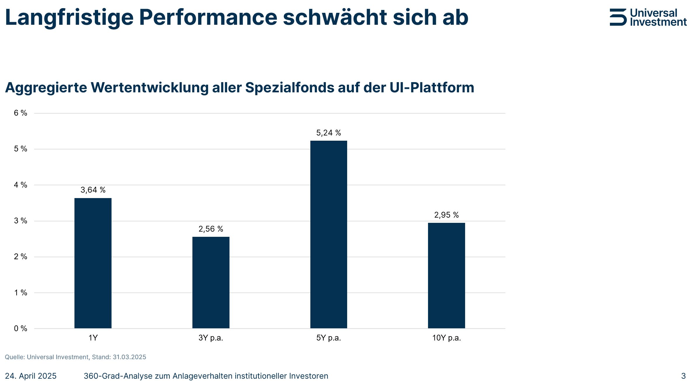 Die Auswertung erfasst alle Anlagen in Spezialfonds bei Universal Investment für den Zeitraum Dezember 2011 bis zum 31. März 2025 und wird regelmäßig aktualisiert. Das Gesamtvolumen der analysierten Assets under Administration beträgt rund 616,6 Milliarden Euro und damit etwa 28% des vom BVI zuletzt ausgewiesenen Spezialfondsvermögens.