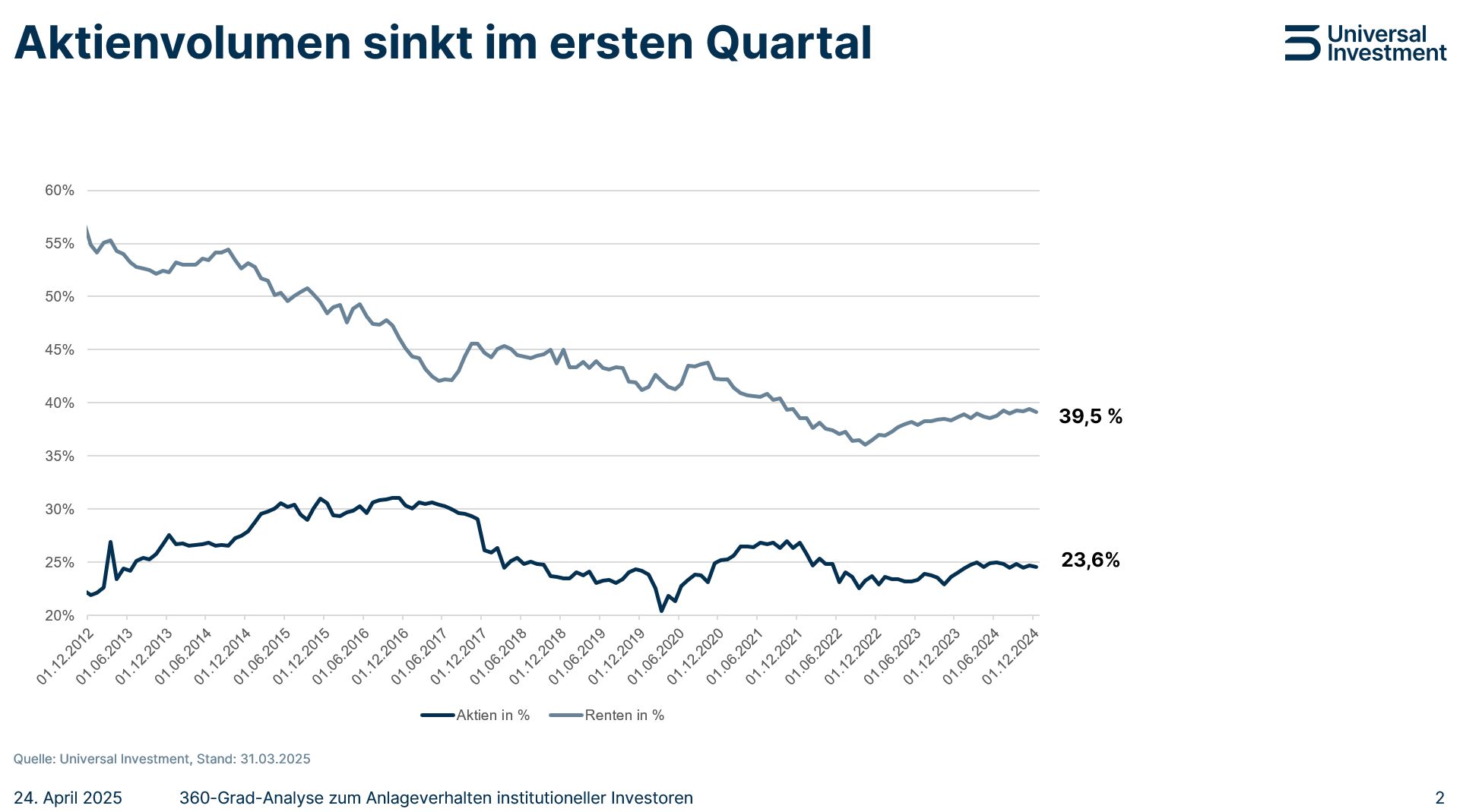 Schon vor der dramatischen Zuspitzung durch die US-Zollpläne am 2. April steuerten Anleger wieder häufiger sichere Häfen wie Gold an, das bis Ende März auf über 3.100 US-Dollar pro Feinunze stieg. Ein Teil ihrer Aktienmarktgewinne nahmen sie mit, so dass der MSCI World im ersten Quartal 1,68% nachgab. Der Stimmungswandel ist auch an den Spezialfonds auf der Plattform von Universal Investment abzulesen. Aktienbestände wurden reduziert beziehungsweise litten unter den Kursrückgängen, während Investoren ihre Positionen in Anleihen erhöhten. Unter dem Strich sank das verwaltete Volumen seit Jahresbeginn um rund 5 Mrd. Euro auf 616,6 Mrd. Euro.