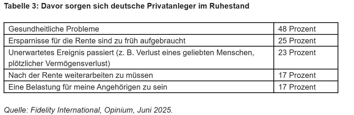 Gefragt danach, was Anlegern im Ruhestand Sorgen bereitet, geben 48 Prozent gesundheitliche Probleme an. Jeder Vierte (25 Prozent) befürchtet, dass die Rücklagen für das Alter zu früh aufgebraucht sein könnten. 17 Prozent machen sich darüber hinaus Sorgen, im Ruhestand weiterarbeiten zu müssen.