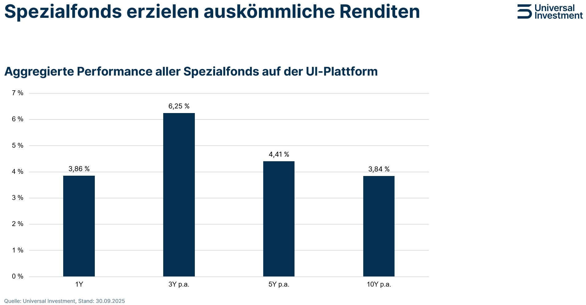Die Auswertung erfasst alle Anlagen in Spezialfonds bei Universal Investment für den Zeitraum Dezember 2011 bis zum 30. September 2025 und wird regelmäßig aktualisiert. Das Gesamtvolumen der analysierten Assets under Administration beträgt rund 643 Milliarden Euro.
